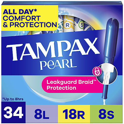 Say goodbye to leak checks and hello to worry-free periods with Tampax Pearl - the ultimate tampon for a no-see no-feel* period experience. Only Tampax has a LeakGuard braid that helps stop leaks before they happen. Plus, Tampax gently expands to fit your unique shape. Inserting Tampax Pearl tampons is made easy thanks to the applicator’s Anti-Slip Grip. Get all day comfort and protection for up to eight hours with Tampax Pearl tampons. Choose from five different absorbencies to match your changing flow. Got leaks? Go up an absorbency. Uncomfortable to remove? Go down an absorbency. Tampax Pearl Tampons have a smooth comfort layer for easy removal, even on your light days. How to insert a tampon: Slowly insert the tampon applicator from the tip, all the way to the grip. After you’ve pushed the plunger in all the way, pull the applicator out. How to remove a tampon: You'll use your thumb and finger to grip the string and pull it slowly out. Properly dispose of your tampon in the trash. Tampax Tampons are made without perfume and latex. Plus, Tampax products are OEKO TEX standard 100 certified, meaning they are tested for up to 1,000 harmful substances.** Ready to ditch the leaks? Get amazing protection with Tampax, the #1 tampon brand recommended by U.S. Gynecologist.*** Discover your perfect flow combo and get the protection you need. (*when inserted correctly ***Certificate #24.HUS.14474 ***based on 2024 survey),MADE WITHOUT PERFUME