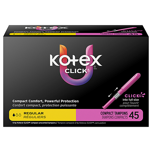 Get up to 100% leak-free protection and stay confident throughout your day with U by Kotex Click Compact Tampons! Made without fragrance, Click tampons for women are designed for your comfort and have a smooth tip for easy and comfortable insertion. Each tampon features ComfortFlex grooves that move with y ou for outstanding comfort. Try U by Kotex Click Tampons and see why the #1 compact tampon* is chosen by women every 1.9 seconds. Pocket-sized and small enough to carry in your purse or pocket, these tampons go from compact to a full-size tampon in one easy step giving you comfortably compact, powerful protection. Pull the lower half of the tampon and when it locks in place, it’s ready to go! U by Kotex Click Compact Tampons are available in regular, super and super plus absorbencies. For backup period protection, try U by Kotex Barely There Pantiliners. U by Kotex feminine products are FSA/HSA/HRA-eligible in the U.S. Packaging may vary from images shown.*Based on sales data**Among those with a preference