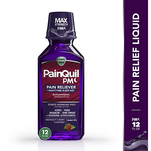FIGHT PAIN FAST with Vicks PainQuil PM adult liquid pain reliever + nighttime sleep aid! For pain relief at night, PainQuil PM Liquid Pain Reliever starts working fast for headache relief, backache relief, muscular ache relief, and relief of other minor aches & pains + 50mg diphenhydramine HCl per dose to help you sleep soundly. PainQuil PM Liquid Pain Reliever delivers max strength+ pain relief with 1000mg Acetaminophen per dose. This adult pain reliever liquid is easy to take & delicious with a midnight cherry flavor. PainQuil PM Pain Reliever Liquid + Nighttime Sleep Aid is non-habit forming. They are also free of high fructose corn syrup and free of sugar. PainQuil Liquid Pain Relief is from the makers of Vicks, with 130 years of health care expertise.