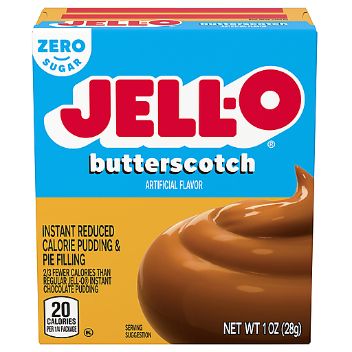 Snack happy. Jell-O Zero Sugar Butterscotch Artificially Flavored Instant Reduced Calorie Pudding Mix & Pie Filling tastes delicious whether you enjoy it as a treat or use it as an ingredient in your favorite dessert recipes. Add some wonder to your day with a delicious snack. Fun to make with your kids, our zero sugar artificially flavored butterscotch pudding mix can also be used to create a poke cake, tasty crepes or butterscotch pie filling. You'll feel good about serving our zero sugar pudding mix that is 2/3 fewer calories than regular Jell-O instant chocolate pudding; as packaged, this product contains 20 calories, regular product contains 100 calories. Our zero sugar artificially flavored butterscotch pudding is ready in as little as five minutes. Simply stir milk into the pudding mix and allow to set. Every zero sugar Jell-O pudding mix comes packaged in a 1-ounce sealed pouch. Pudding fun in every bite.