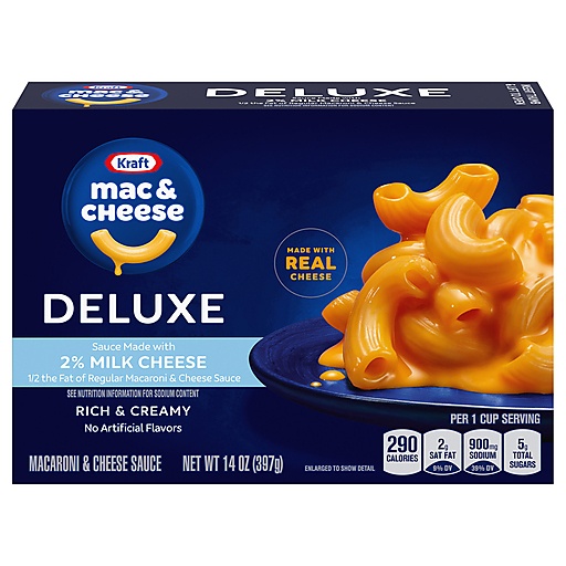 Help yourself to a bowl of comfort. Kids and adults love the rich taste of Kraft Deluxe Mac & Cheese Macaroni and Cheese Dinner with Sauce Made with 2% Milk Cheese. Our 14-ounce mac and cheese box includes macaroni pasta and cheese sauce mix to make tasty mac and cheese kids love. Our warm, cheesy macaroni goodness fills your belly and feeds your soul. With no artificial dyes or flavors, Kraft Macaroni and Cheese is always a great choice for family dinners. Looking for quick meals, sides or kids meals? Simply boil 2 quarts of water, stir in macaroni and cook 11-12 minutes. Drain the macaroni and return to the pan. Then squeeze the cheese sauce over the hot macaroni and stir until blended. Stir up new ways to enjoy Kraft Mac n Cheese by adding protein or seasonings to make it your own. Try crispy bacon, shredded rotisserie chicken, steamed broccoli, hot sauce, and more! A wholesome tradition, Kraft Mac & Cheese has been bringing generations together since 1937. Kraft Mac & Cheese inspires the positive power of comfort, so keep your pantry stocked with our dinner sides and enjoy cheesy goodness anytime.
